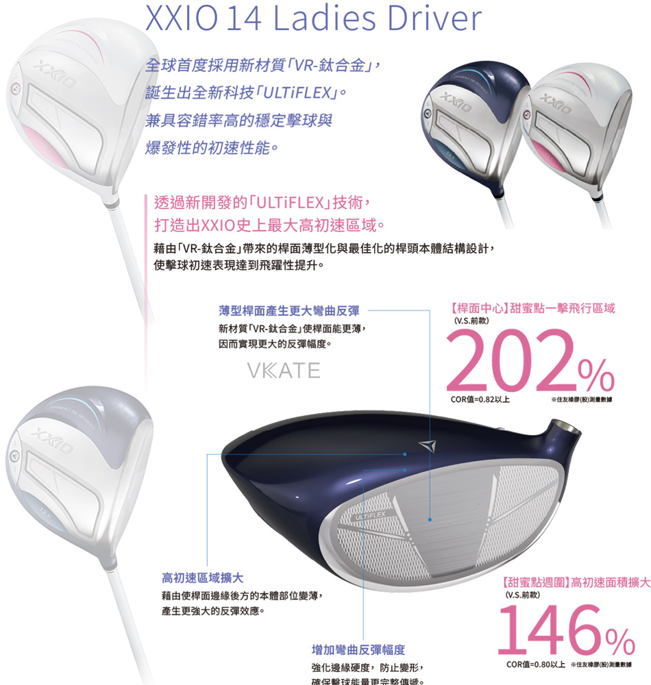 透過新開發的「ULTiFLEX」技術,打造出XXIO史上最大高初速區域。藉由「VR-鈦合金」帶來的桿面薄型化與最佳化的桿頭本體結構設計,使擊球初速表現達到飛躍性提升。